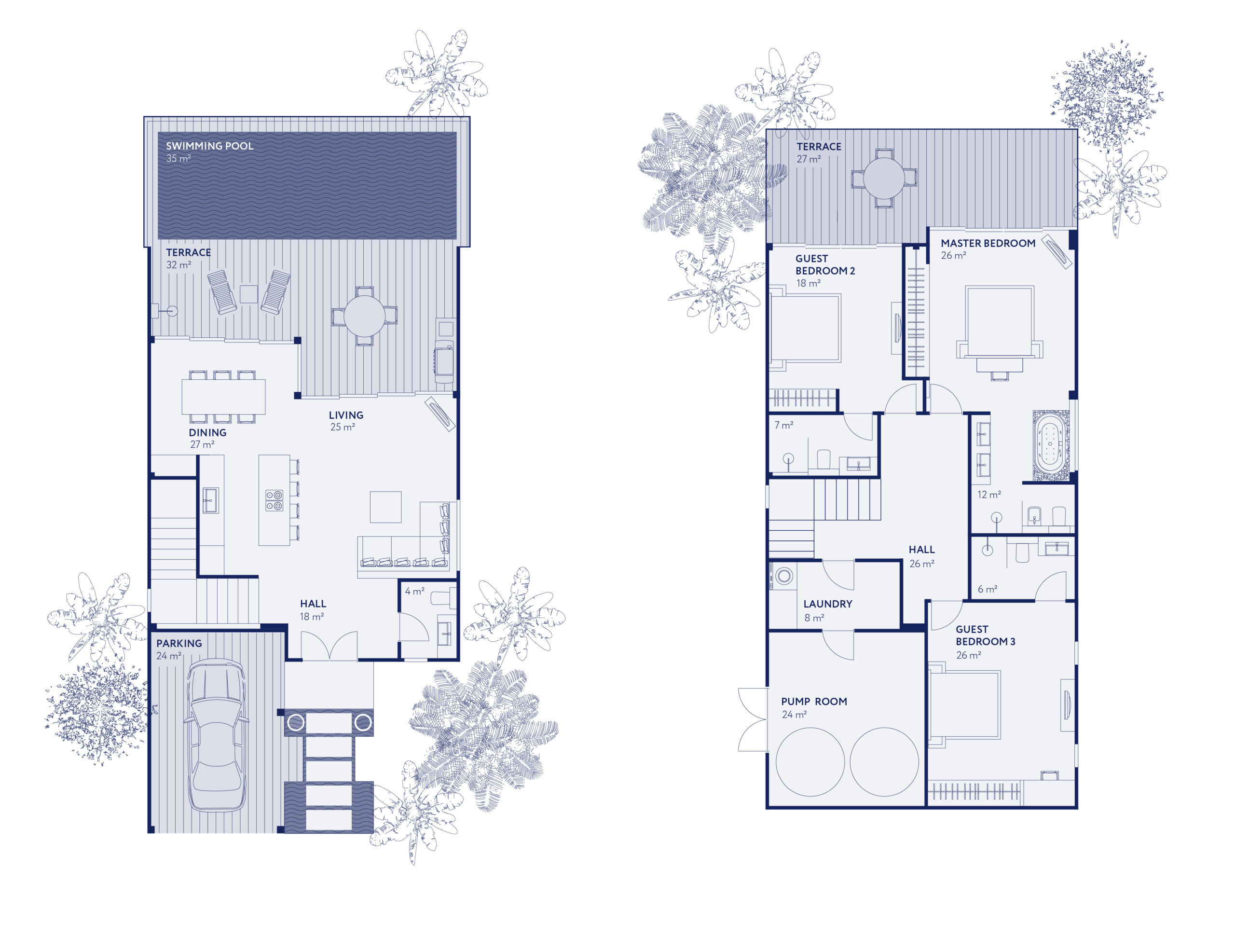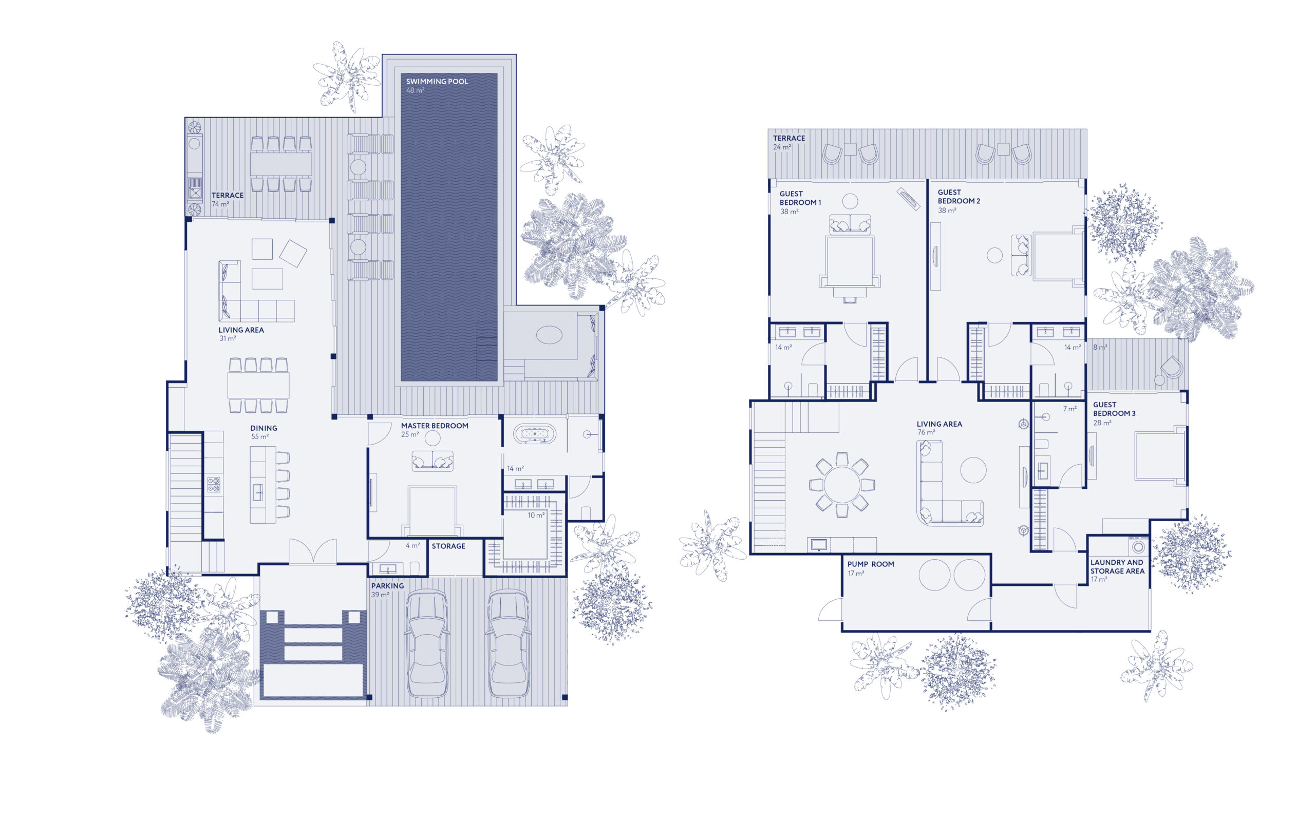 Layout: 3-5 camere da letto su due livelli, tutte con bagno privato e cabina armadio.