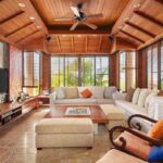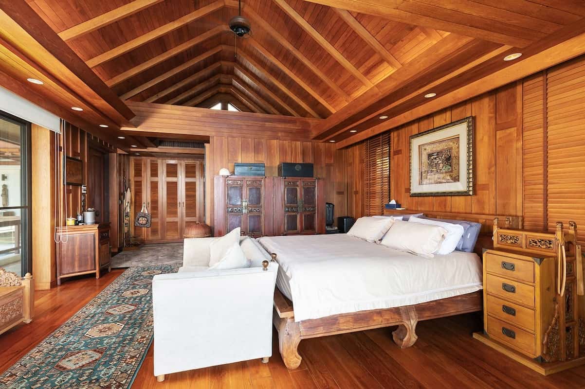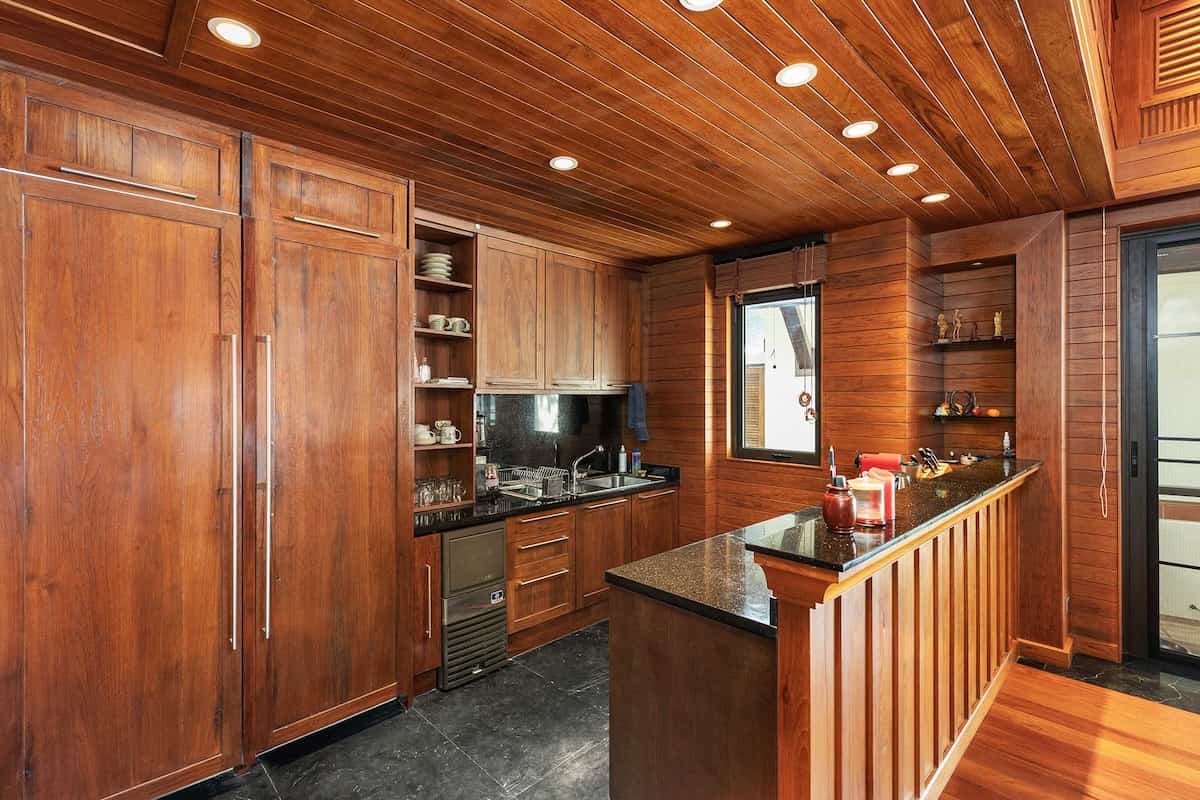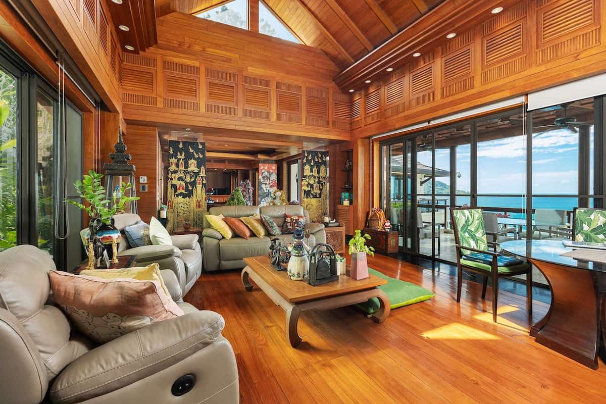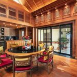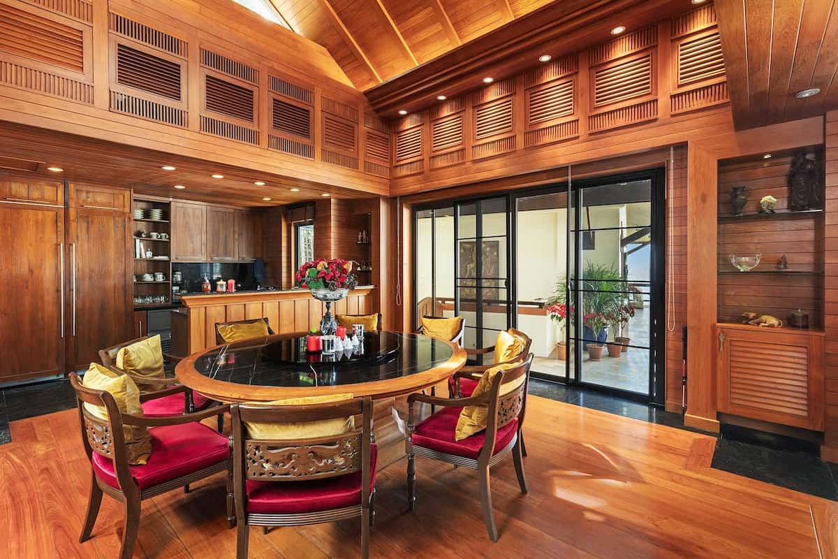 All'interno, gli interni sono una celebrazione dell'eleganza e dell'artigianato. La sala da pranzo è dotata di uno straordinario tavolo da 10 posti con piano in marmo, circondato da lussuose sedie imbottite, che creano uno spazio funzionale ed elegante. I pannelli in legno dipinti a mano da un rinomato artista thailandese aggiungono un tocco artistico unico, collegando perfettamente la sala da pranzo al soggiorno rivestito in teak.