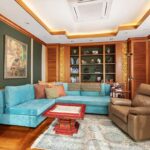 Questo accogliente spazio abitativo è impreziosito da divani in velluto, opere d'arte personalizzate e librerie a muro. Porte in vetro dal pavimento al soffitto incorniciano viste sui lussureggianti giardini e sui tranquilli giochi d'acqua, portando all'interno la bellezza dell'esterno.