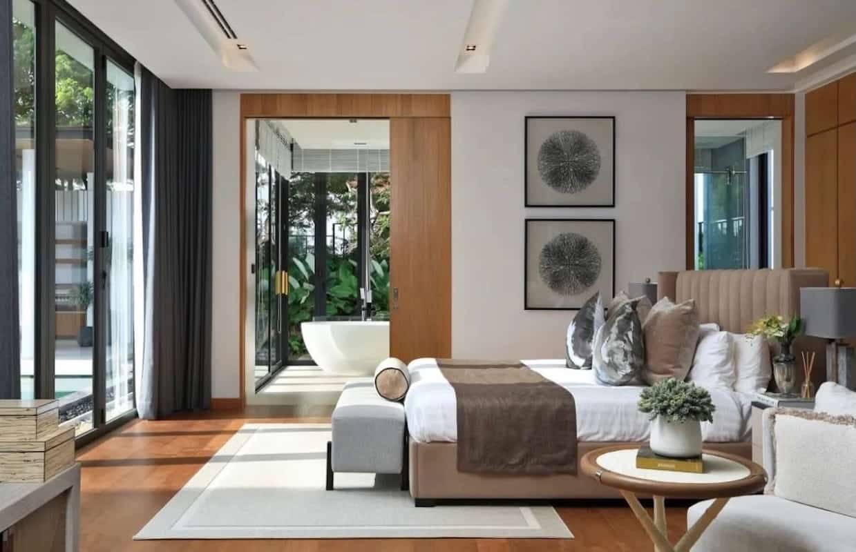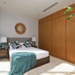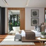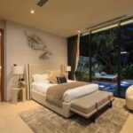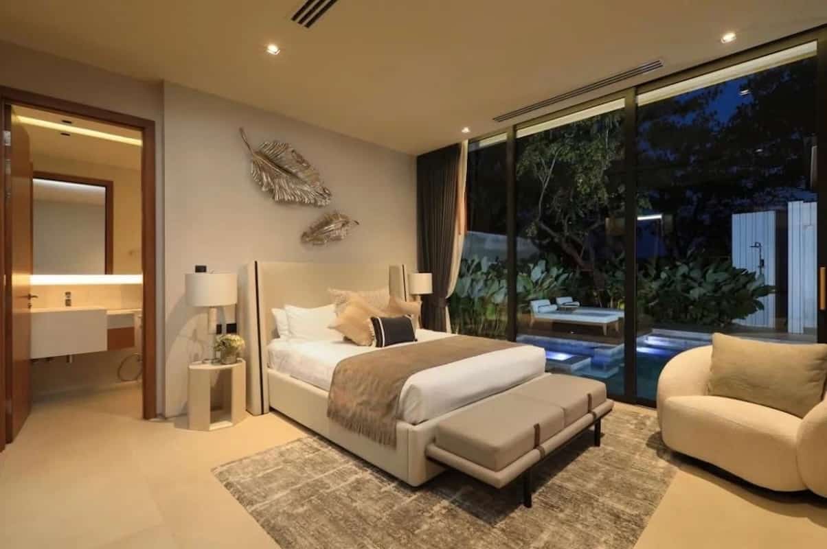Le suite con quattro camere da letto della villa sono state progettate come rifugi privati, ognuno dei quali offre proporzioni generose e finiture lussuose. La master suite occupa un'ala a sé stante, dotata di un'ampia zona notte con posti a sedere, cabine armadio per lui e per lei e un bagno simile a una spa con doppi mobili da bagno, una vasca da bagno indipendente e una doccia a pioggia separata. Porte in vetro si aprono su una terrazza privata con vista sui giardini, creando un collegamento senza soluzione di continuità con l'esterno.