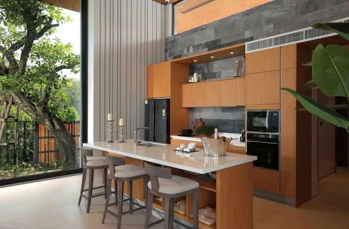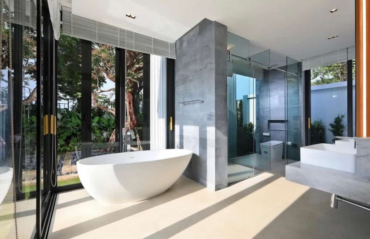Le aree esterne sono state progettate per rivaleggiare con i migliori resort di Phuket, incentrate su una splendida piscina di 12 metri che sembra fondersi con l'orizzonte. Numerosi ponti prendisole, una cabana ombreggiata con lettini e una doccia esterna creano l'ambiente perfetto per il relax. La terrazza coperta dispone di una cucina esterna completa con barbecue incorporato, bancone bar e zona pranzo – il sogno di ogni intrattenitore circondato da lussureggianti giardini tropicali.